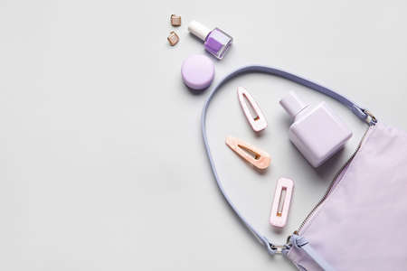 Stylish bag with decorative cosmetics and wooden hand on light background