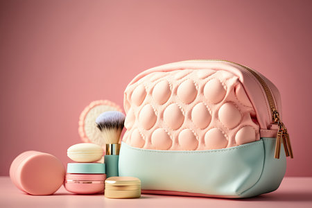 Pink make-up bag with cosmetic products. Illustration Generative AI