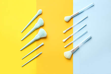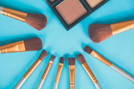 Set of makeup brushes on blue and white colored composed background. Top view point, flat lay.