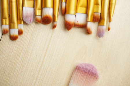 make-up brushes on the brown wooden background