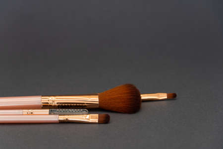 pink makeup brushes on a dark gray background. luxury cosmetics.