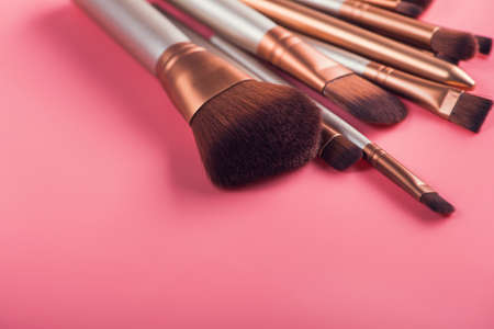 Various make-up brushes on pink background with copy space, top view. Cosmetics and beauty concept.