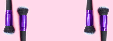 Banner top view flat lay of cosmetics brushes set for makeup at the left side on pink background. Cosmetics and beauty concept. Make up concept with space for text
