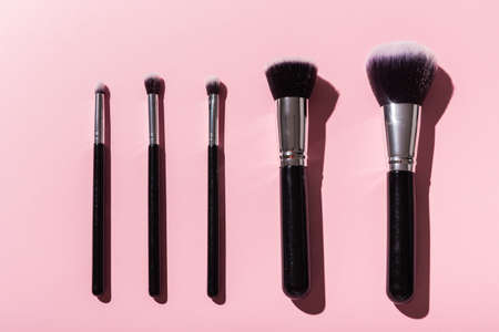 cosmetic brushes for makeup on a pink background, fashion, beauty