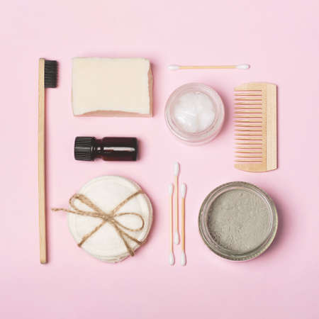 Top view of means for face care: bottles and jars of tonic, micellar cleansing water, cream, cotton pads on colored background. Bodycare concept with empty cpace for your ideas.