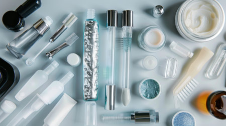 Make-up products set. Female cosmetics bag with various beauty make-up products. Professional make-up accessories tools on bright background.