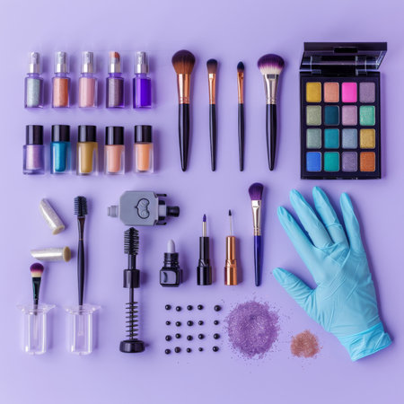 Professional decorative cosmetics and makeup tools brushes on colorful background. Beauty and fashion concept. Flat lay composition. Top view.