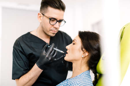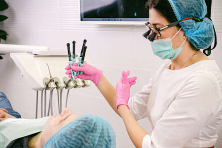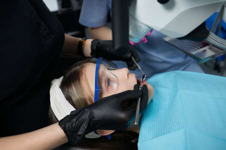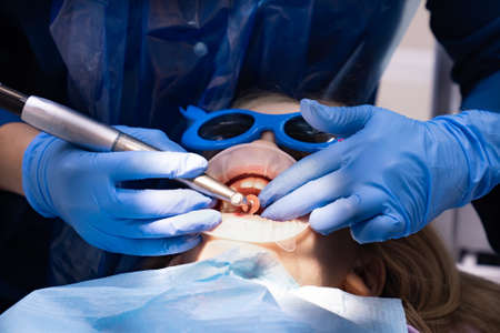Dentist doing a dental treatment on a female patient. Surgery close-up.