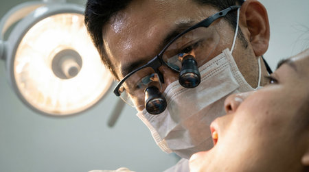 dentist checks the teeth of a client in a dental clinic. The dentist is using special glasses for a detailed examination. The room is bright with overhead lighting.