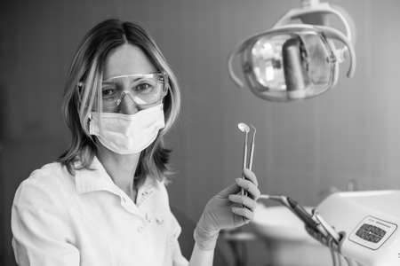 Portrait of woman dentist doctor with instrument in dental office, black and white photo.