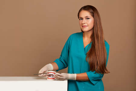 Dentist with tools. Concept of dentistry, whitening, oral hygiene, teeth cleaning with toothbrush, floss. Dentistry, taking care of a beautiful and healthy smile. Dental tooth care clinic. Stomatology