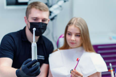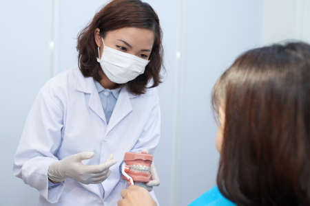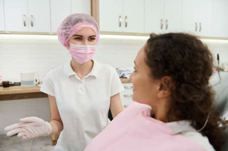Pretty dental assistant, dentist hygienist in protective safety medical wear consulting female patient, client of dentistry clinic, giving medical recommendations about dental hygiene and oral health