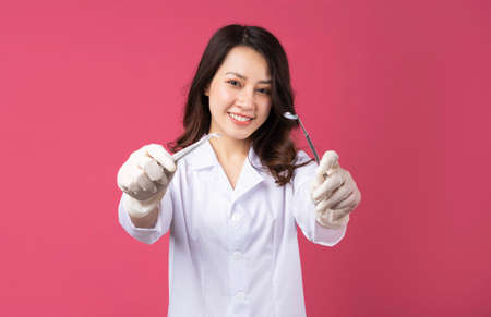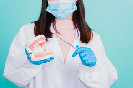 Asian beautiful woman dentist holding professional tool and pointing model teeth denture, female doctor checking denture isolated on blue background. Dental hygiene surgery health care concept