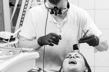 Male dentists examining and working on young female patient.Dentists office. Real woman in a chair at the dentist. vertical photo. toned