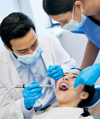 A male dentist with dental tools drills the teeth of a patient with an assistant. The concept of medicine, dentistry and healthcare.