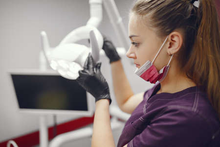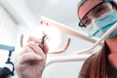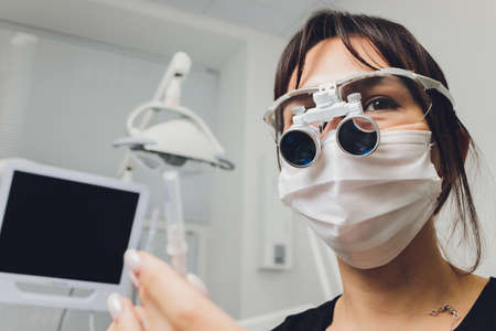 Side view photo of woman dentist in dental loupe binoculars, medical gloves and mask holding tools for curing the patient teeth in the dental clinic.