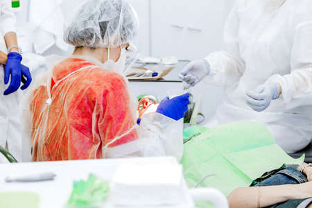 Woman dentist in a red medical suit treats teeth to a patient. There are dental assistants next to the chair. Horizontal photo