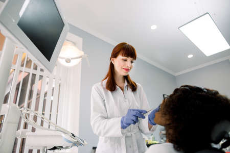 Pretty female dentist wearing gloves, performing dental check up and treatment on patients teeth. African american woman lying in chair, receiving dental treatment with mouth open.