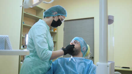 Male dentist and his team wearing face mask and protective clothes putting dental injection to unrecognized patient
