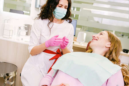 Young adult woman have a visit in the dentist clinic. Conception of stomatology.