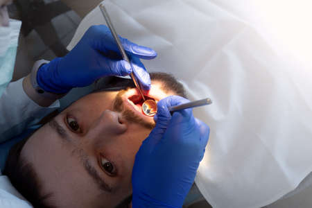 Man on examination at the dentist. Cleaning plaque and tartar in a dental clinic. Preventive Dental hygiene and check up