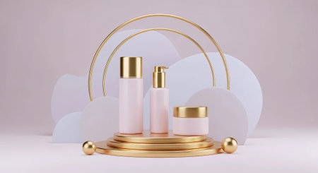 3d rendering of pink and golden cosmetic bottles with pearls on podium
