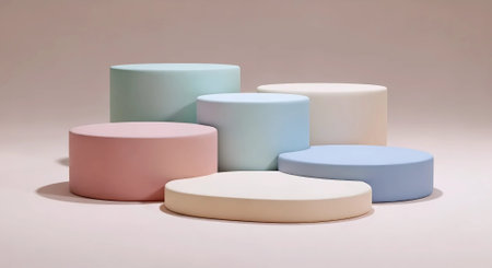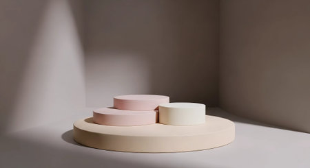Three smooth matte cylinders arranged in varying heights with a soft gradient from beige to light gray tones set against a plain light background. The feature subtle shading and a clean...