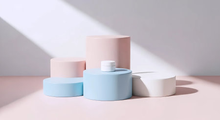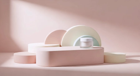 3d render, abstract minimal geometric shapes composition, pastel colors, podium for product presentation, cosmetic mockup