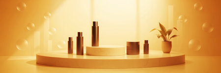 Assortment of cosmetic bottles and a potted plant displayed on a circular platform in studio setting