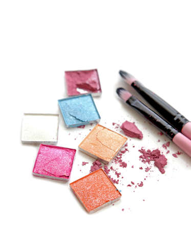 Cosmetics swatches beauty products eyeshadow on white background. Top view.