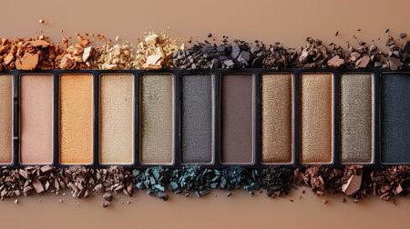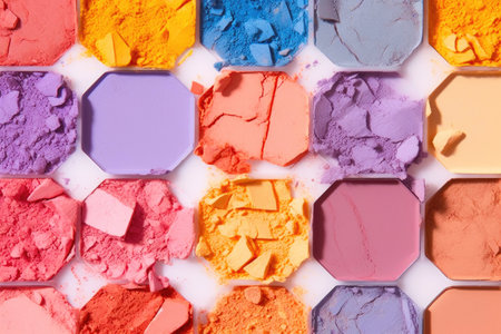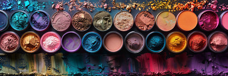 A detailed close-up of vibrant powdered cosmetics in an array of shades, artfully arranged to showcase different textures and colors
