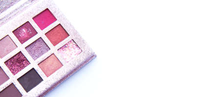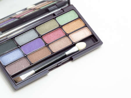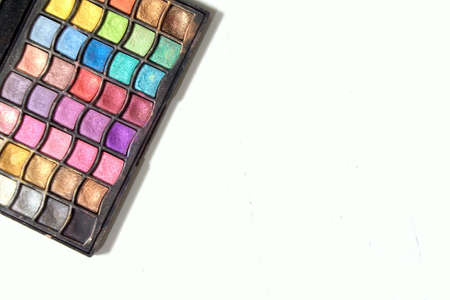 Eyeshadow colorful palette for makeup on a white background. Eyeshadow with multicolored sparkles. Nude cosmetics. Top view
