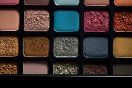 Vibrant beauty collection eyeshadow palette, shiny metal equipment, elegant decoration generated by artificial intelligence