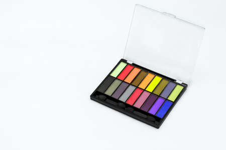 Multi-colored eye shadow palette. Bright colors and shades in cosmetics. Minimalism cosmetic concept.