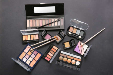 multi-colored eyeshadows for make-up and brushes on a dark background, beauty fashion makeup