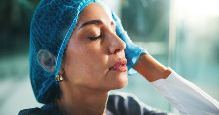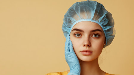 A woman in a blue hairnet and glove thoughtfully touches her face while contemplating cosmetic surgery in a clinic setting.
