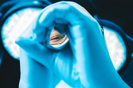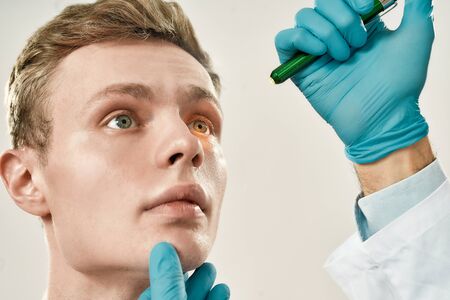 Visiting ophthalmologist. Close up of doctor in blue sterile gloves examining eyes of young male patient in ophthalmology clinic