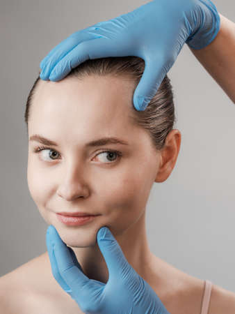 Closeup consultation with plastic surgeon on white background. Cosmetic rejuvenating facial treatment. Doctor man with blue medical gloves touches girl face. Patient ask about lips and chin injections