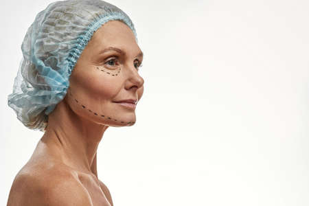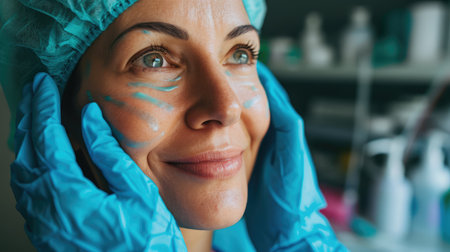 Cheerful excited middle aged woman in medical hat with pre surgery marks on her face looking at copy space for ad and smiling, surgeon hands in blue gloves touching female skin