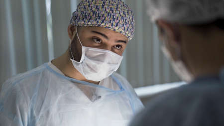 Professional caucasian male surgeon doctor during operating procedure