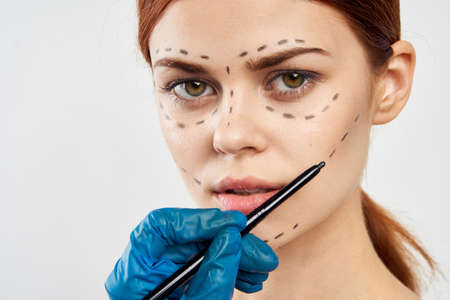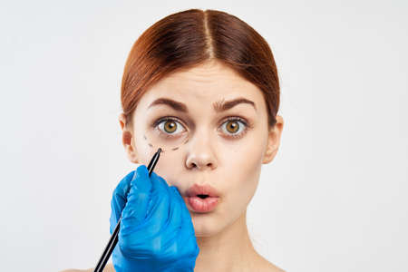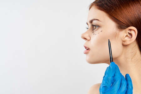 young woman goggling for an operation on the face of a punkter line on a light background portrait, surgeon, face rejuvenation.