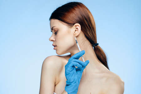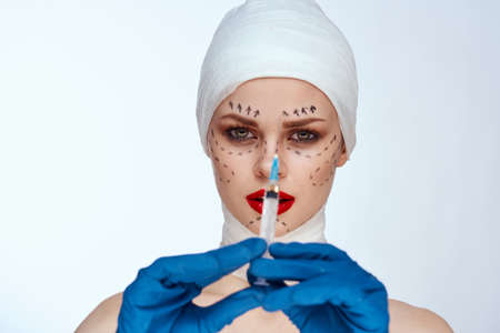 beautiful woman in blue gloves syringe in hands contour on the face lifting studio lifestyle