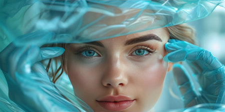 woman posing in blue gloves red lips surgery facial rejuvenation studio lifestyle