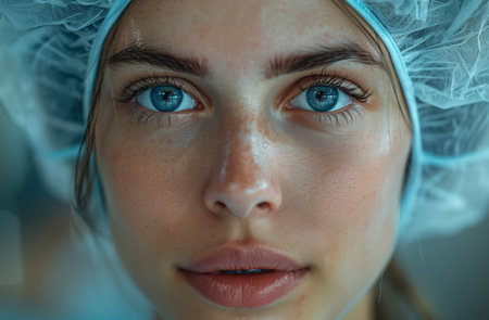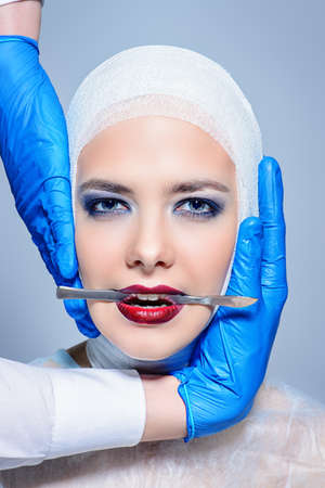 Close-up studio portrait of a young beautiful blonde girl, in a medical cap, next to four hands of plastic surgeons holding surgical instruments near their faces