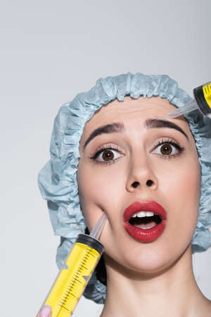 huge syringes near face of shocked young woman in surgical cap isolated on grey