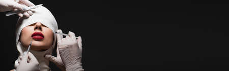 woman in elastic bandage near plastic surgeons with surgical knife and syringes isolated on grey, banner