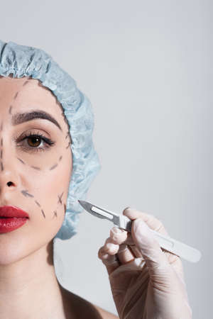 Hands with scalpel near middle aged woman face