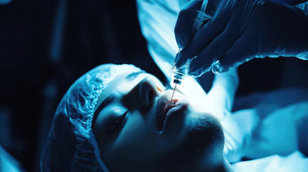 woman in blue gloves syringe in hands contour on the face lifting studio lifestyle
