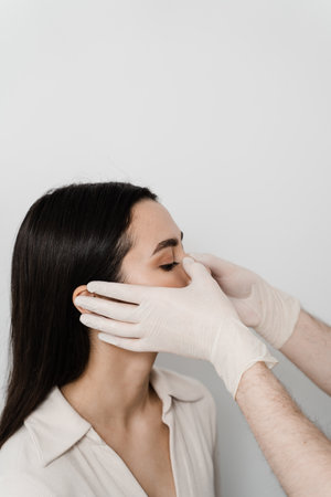 Cosmetic surgeon examining female client in office. Doctor checking womans face, the nose before plastic surgery. Surgeon or beautician hands touching woman face. Rhinoplasty