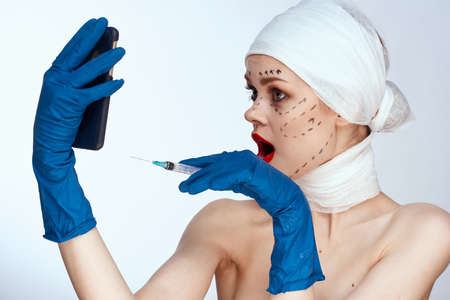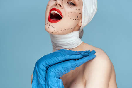 emotional woman plastic surgery operation bare shoulders light background